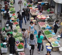 甘肅省隴南市努力做好各項(xiàng)生活必需品供應(yīng),確保因汶川地震而受災(zāi)的群眾生活不出問(wèn)題。5月13日,甘肅省隴南市武都區(qū)的居民在一個(gè)菜市場(chǎng)內(nèi)買菜。 新華社記者:韓傳號(hào)