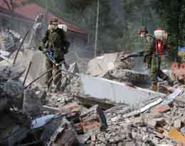 5月19日,成都軍區(qū)防化團(tuán)官兵在地震中變成一片廢墟的北川中學(xué)噴灑消毒藥劑。新華社記者:陳樹根