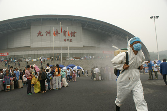 | 綿陽的九洲體育館是當?shù)刈畲蟮陌仓脼拿竦臓I地。5月24日,一名防疫人員在此進行消毒作業(yè)。新華社發(fā)(鄭宇鈞