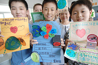 | 杭州市的小學(xué)生展示他們制作的保護(hù)土地宣傳卡。胡冠華