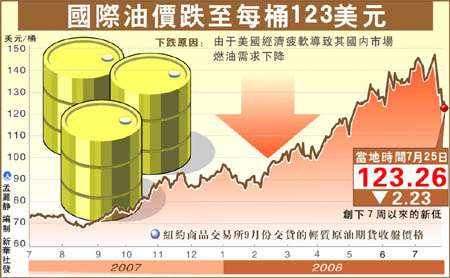 7月25日,國際幾大石油交易市場(chǎng)的表現(xiàn)創(chuàng)下了一段時(shí)間以來的價(jià)格新低。當(dāng)天,紐約商品交易所9月份交貨的輕質(zhì)原油期貨價(jià)格開盤后一路下跌,觸底至每桶122.50美元,收盤時(shí)報(bào)于123.26美元,比前一個(gè)交易日下跌了2.23美元。倫敦國際石油交易所9月份交貨的北海布倫特原油期貨價(jià)格下跌1.92美元,收于每桶124.52美元。 此外,紐約商品交易所8月份交貨的汽油期貨價(jià)格每加侖下跌2.71美分,收于3.0323美元;8月份交貨的取暖油期貨價(jià)格每加侖下跌4.42美分,收于3.5229美元;8月份交貨的天然氣期貨價(jià)格每千立方英尺下跌19.9美分,收于9.084美元。 業(yè)界普遍認(rèn)為,此輪油價(jià)回落是由于美國經(jīng)濟(jì)疲軟導(dǎo)致其國內(nèi)市場(chǎng)燃油需求下降。美國能源部上周發(fā)布報(bào)告顯示,目前美國國內(nèi)市場(chǎng)對(duì)燃油的平均日需求量降到了2007年1月以來的最低水平。 與此同時(shí),市場(chǎng)初步估算7月份石油輸出國組織(歐佩克)原油日產(chǎn)量比上月增加了20萬桶,緩解了投資者對(duì)原油供應(yīng)的擔(dān)心。歐佩克第一大產(chǎn)油國沙特在過去兩個(gè)月中連續(xù)兩次增產(chǎn),試圖抑制油價(jià)猛漲的趨勢(shì)。