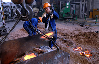 | 寧波慈溪市盛泰電子金屬材料有限公司的熔鑄車(chē)間,一些工人在工作。浙江省企業(yè)狠抓內(nèi)部節(jié)能管理,有效降低成本。新華社記者