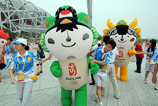 8月8日,志愿者、游人紛紛與充氣“福娃”合影留念。新華社記者 徐昱 攝