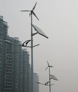 近日,一種“風(fēng)光互補(bǔ)”型路燈在湖北襄樊市沿江大道亮相。這種新型路燈利用自然界的風(fēng)能和太陽(yáng)能雙系統(tǒng)供電,在蓄電池電量充足的情況下,即使沒(méi)有能源的補(bǔ)給,也能連續(xù)工作5個(gè)晚上。新華社發(fā)(龔波