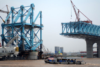 8月28日,南京大勝關(guān)長(zhǎng)江大橋8號(hào)墩與9號(hào)墩之間的鋼梁架設(shè)工作正在進(jìn)行。南京大勝關(guān)長(zhǎng)江大橋工程位于南京長(zhǎng)江大橋上游約20公里處,全長(zhǎng)9.273公里,是京滬高速鐵路的控制性工程,也是滬漢蓉鐵路通道及南京鐵路樞紐的重要組成部分。 |