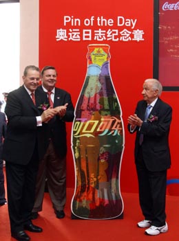 8月8日,國際奧運會主席羅格(左)和國際奧運會名譽(yù)主席薩馬蘭奇(右)在北京“可口可樂”奧林匹克官方紀(jì)念章交換中心為首枚“奧運日志紀(jì)念章”亮相揭幕“奧運日志紀(jì)念章”在北京奧運會期間每天只發(fā)行一枚。新華社記者:張燕輝 攝
