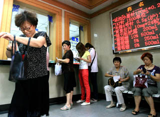 9月2日,一些患者在上海市普陀區(qū)某公立醫(yī)院藥房取藥。2008深化醫(yī)院管理年活動暨全國醫(yī)政工作會議傳出信息,我國將選擇部分城市進行公立醫(yī)院改革試點,要改革以藥養(yǎng)醫(yī)機制,有效降低群眾醫(yī)藥負擔(dān)。
