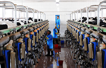 | 黑龍江省八五七農(nóng)場一奶牛場,工人們在車間工作。新華社記者 王建威