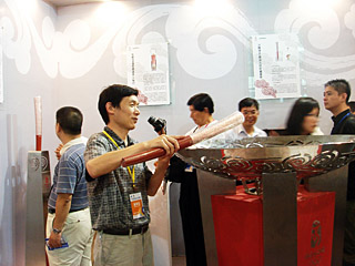 | 第五屆專博會(huì)上,參展觀眾對(duì)華帝公司展出的奧運(yùn)祥云火炬、圣火盆產(chǎn)生了濃厚興趣。本報(bào)記者 肖思思