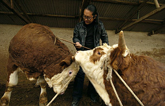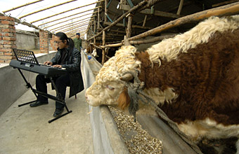 “禿頭,乖,別動”,劉海川一邊梳毛,一邊不停地給禿頭說話。禿頭是劉海川養(yǎng)牛場的一頭牛,因為沒長角,被他稱作禿頭。與禿頭一樣,這里的幾十頭牛都有自己的名字,“我都把它們當成自己的孩子,時間長了一喊名字,它們就有反應(yīng)”,劉海川說。 劉海川的養(yǎng)牛場不大,但很特別,每個牛圈都安裝了音箱,這讓禿頭和其它幾十頭牛每天能聽到美妙的鋼琴曲。每當《梁!返葍(yōu)美的曲子響起,這些牛變得溫順,用劉海川的話說“牛脾氣不見了,好管理了”。 2007年5月開辦養(yǎng)牛場后,劉海川遇到過問題,但勤奮好學的他每次都能找到解決辦法。 一次偶然的機會,長時間不彈鋼琴感覺技癢的劉海川在養(yǎng)牛場彈鋼琴,彈著彈著,他發(fā)現(xiàn)聽到琴聲后,安靜的牛群有了動靜。伴隨著激昂或柔美的琴聲,牛群時而狂躁,時而悠閑。 查閱大量資料后,劉海川發(fā)現(xiàn),在國外早就有飼養(yǎng)員給牛聽音樂的事例。從那以后,每逢晴天,劉海川就把鋼琴搬到院里,給牛彈各種柔美的曲子。天氣變冷,劉海川擔心鋼琴長時間在戶外不利于保養(yǎng),就在各個牛圈里裝上音箱,每天定時給牛群播放鋼琴曲。 一段時間后,“對牛彈琴”不僅使牛聽話了,牛肉也變得更好吃了。不少客戶品嘗了劉海川的牛肉后,表示味道鮮美,F(xiàn)在,劉海川養(yǎng)的牛銷路好,每批牛都提前接到訂單,價格也不錯。
