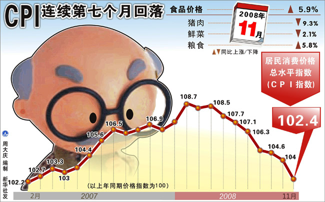 國(guó)家統(tǒng)計(jì)局11日公布,11月份中國(guó)消費(fèi)價(jià)格指數(shù)(CPI)同比上漲2.4%,漲幅比上月快速回落1.6個(gè)百分點(diǎn)。今年以來,我國(guó)CPI已經(jīng)連續(xù)7個(gè)月回落,并創(chuàng)下自2007年2月以來近22個(gè)月以來的新低。加上10日公布的11月份生產(chǎn)資料價(jià)格(PPI)增幅跳水4.6個(gè)百分點(diǎn),專家認(rèn)為當(dāng)前中國(guó)面臨的通貨緊縮壓力正在增加。