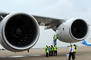 | 被譽(yù)為“空中巨無霸”的空客A380型客機(jī)在珠海機(jī)場參加今年的第七屆珠海航展。新華社記者 周文杰