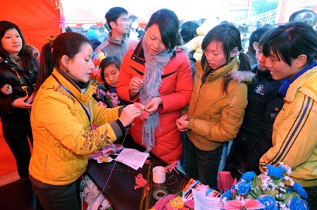節(jié)前送崗位,過年也安心。1月14日——15日,江西東鄉(xiāng)縣勞動(dòng)就業(yè)部門組織舉辦了返鄉(xiāng)農(nóng)民工專場(chǎng)招聘會(huì)。剛從廣東東莞返鄉(xiāng)的胡霞(右四)等正在南昌唯美創(chuàng)意絲網(wǎng)花招聘臺(tái)前學(xué)做絲網(wǎng)花。新華社記者:宋振平