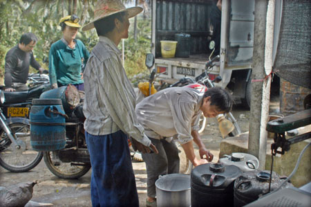 2008年12月20日,瓊海市石壁鎮(zhèn)的群眾正在出售膠乳。 受金融危機影響,2008年下半年以來,海南橡膠價格一路走低,目前膠價每噸降至萬元以下。為保護農(nóng)民利益,海南農(nóng)墾以12000元每噸的保護價收購橡膠,切實保護農(nóng)民利益。新華社發(fā)(蒙鐘德攝) | 2009年春節(jié)要來臨的時候,北國大地依然處于最寒冷的季節(jié)。然而,在祖國最南端的海南省的農(nóng)場里、膠園中,卻熱流涌動、激情澎湃。被譽為海南省體制改革一號工程、受到中央領(lǐng)導(dǎo)和社會各界廣泛關(guān)注的農(nóng)墾體制改革,正進入了攻堅階段。 專家指出,海南農(nóng)墾改革雖然在2008年成效顯著,但是由于各種復(fù)雜因素的影響,2009年改革面臨的困難可能比2008年更大。鑒于海南農(nóng)墾承擔(dān)著全省經(jīng)濟發(fā)展新的火車頭的戰(zhàn)略重任,這項改革只能成功、不能失敗。