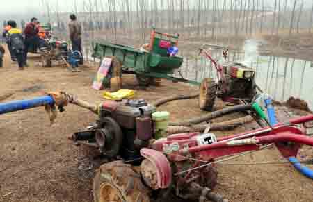 小農機發(fā)揮大作用。2月6日,在河南省洛陽市伊川縣鳴皋鎮(zhèn)武莊村,村民把手扶拖拉機集中在一起準備抽水澆灌麥田。新華社記者:王頌