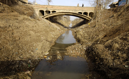 陜西關中麥區(qū)見聞——大型灌區(qū)“帶病運行” 小型水利“仍吃老本”。圖為陜西省渭南市大荔縣許莊鎮(zhèn)境內渠道破損、淤積嚴重的洛惠渠灌區(qū)東干渠。新華社記者:陳鋼