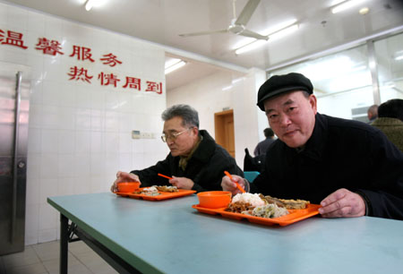 “老年食堂”、“白領(lǐng)午餐”、“零星舊里改造”、“支部建在樓上”……在“全國文明城區(qū)”上海市靜安區(qū),不僅能看到高大的商務樓宇、整潔的市容市貌,還能從群眾口中聽到這些耳熟能詳?shù)拿~。近年來,靜安區(qū)始終堅持把創(chuàng)建工作與“民心工程”相結(jié)合,走出了一條科學發(fā)展之路。 2月12日,在靜安區(qū)石門二路街道新福康里“樂齡家園”,社區(qū)的老人們正在用午餐,目前,全區(qū)27個“樂齡家園”每天為老人供應午餐、晚餐2500多份,被老人親切地稱作“老年食堂”。 |