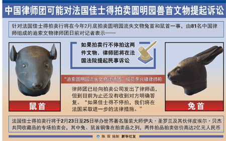 針對法國佳士得拍賣行將在今年2月底拍賣圓明園流失文物兔首和鼠首一事,由81名中國律師組成的追索文物律師團(tuán)日前對記者表示,如果拍賣行不停拍這兩件文物,律師團(tuán)將在法國法院提起民事訴訟。 這個“追索圓明園流失文物律師團(tuán)”成員李興鋒律師說,律師團(tuán)已經(jīng)向拍賣公司發(fā)出了律師函,但到目前為止還沒有收到對方明確答復(fù)。“如果佳士得不停拍,我們將在法國采取進(jìn)一步的法律措施! 事實上,律師團(tuán)自今年1月成立以來在追索兔首和鼠首文物一事上可謂一波三折。起先,根據(jù)法國法律規(guī)定,原告需要與事實有利害關(guān)系,律師團(tuán)一直沒有找到合適的原告。等確定全球愛新覺羅家族宗親會為原告后,所涉及的高額訴訟費以及法院審判需要支付的補(bǔ)償金又沒了著落。近日,一家房地產(chǎn)公司表示愿意出資40萬元支持追索行動,律師團(tuán)的工作才得以繼續(xù)。 據(jù)了解,法國佳士得拍賣行將于2月23日至25日舉辦世界著名服裝大師伊夫·圣羅蘭及其伙伴皮埃爾·貝杰共同收藏品的專場拍賣會,其中兔、鼠首銅像在拍賣品之列,兩件拍品拍賣估價高達(dá)2億元人民幣。 此前有報道稱國家文物局博物館司司長宋新潮表示反對回購。他認(rèn)為既然是中國的東西,就沒有必要用中國的錢買回來。這兩件文物都是由于戰(zhàn)爭原因被掠奪到海外的文物,根據(jù)國際公約,要在道義上進(jìn)行呼吁和追溯,希望其返還。對于追回方式,他首先不希望通過拍賣,其次要尊重收藏家意愿,通過相應(yīng)的補(bǔ)償以回贈方式追回,同時也歡迎和鼓勵通過捐贈的方式促成回歸。 李興鋒說:“不管這次追索結(jié)果如何,現(xiàn)在可以看到中國公眾對這件事的強(qiáng)烈關(guān)注,激起了人們通過法律手段實現(xiàn)保護(hù)國家財產(chǎn)的熱情和認(rèn)識,這將為我們今后追索流失文物提供有利經(jīng)驗!