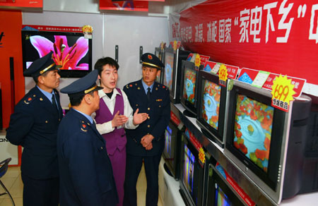 2月24日,北京市工商局懷柔分局執(zhí)法人員在“家電下鄉(xiāng)”專(zhuān)區(qū)查看各種票據(jù)。當(dāng)日,北京市工商局懷柔分局開(kāi)展“家電下鄉(xiāng)惠農(nóng)民”產(chǎn)品質(zhì)量大檢查行動(dòng),對(duì)被指定的5家“家電下鄉(xiāng)”經(jīng)營(yíng)主體進(jìn)行檢查,保證讓農(nóng)民購(gòu)買(mǎi)到放心如意的家電商品。 | 針對(duì)24日媒體披露“家電下鄉(xiāng)”活動(dòng)銷(xiāo)售環(huán)節(jié)存在的問(wèn)題,本報(bào)記者采訪(fǎng)了商務(wù)部和其他相關(guān)部門(mén)。商務(wù)部負(fù)責(zé)家電下鄉(xiāng)的綜合司的同志對(duì)記者表示,目前正在搜集地方情況,近期將會(huì)公開(kāi)表態(tài),可能會(huì)專(zhuān)門(mén)為此召開(kāi)一次新聞發(fā)布會(huì),對(duì)外界的評(píng)論做出回應(yīng)。