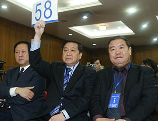 | 3月4日,北京三元集團(tuán)有限責(zé)任公司與河北三元食品有限公司組成的聯(lián)合競拍體代表在“三鹿集團(tuán)”破產(chǎn)首次拍賣會上舉牌競拍。新華社發(fā)(丁立新