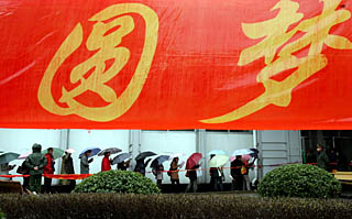 | 圖為在復(fù)旦大學(xué)舉行的招聘會(huì),畢業(yè)生在雨中等待入場(chǎng)。新華社記者 劉穎