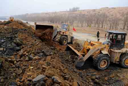 3月11日,在黃河內(nèi)蒙古達(dá)拉特旗昭君墳段,工程機(jī)械正在打堤壩,建造蓄滯洪區(qū)。 為減輕黃河內(nèi)蒙古段防凌壓力,內(nèi)蒙古自治區(qū)在黃河南岸的杭錦旗和達(dá)拉特旗搶修3處分凌蓄滯洪區(qū),以預(yù)防可能到來的特大凌汛。據(jù)介紹,這3個(gè)蓄滯洪區(qū)可分凌近1.4億立方米。
