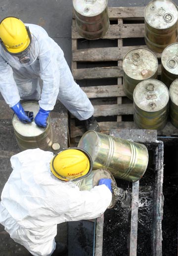 3月11日,身穿防化服的技術人員將易制毒化學品倒入回收容器。當天,天津市公安局緝毒處集中銷毀重量達8.7噸、價值百余萬元的易制毒化學品。銷毀工作先添加化學試劑,然后用高爐高溫處理,不會對環(huán)境造成污染。