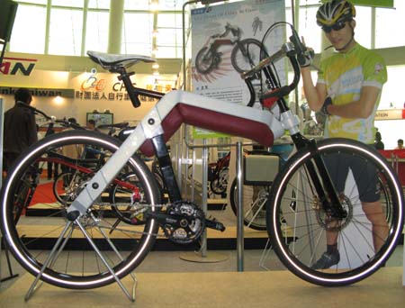 正在臺北舉行的“2009年臺北國際自行車展覽會”上,來自臺灣的徐鵬越和大陸的邵坤、孫宏雨三人共同合作設(shè)計的作品“±×(加減乘)”奪得第十三屆全球自行車設(shè)計比賽唯一的金獎。該作品可以針對騎乘者的需求變換三種不同的車架形式且操作簡單。