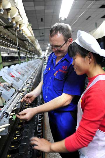 在華西精毛紡廠,一名女工在德國(guó)技術(shù)專家的幫助下學(xué)習(xí)操作新儀器。新華社記者:王頌