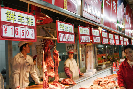 據(jù)國家統(tǒng)計(jì)局內(nèi)蒙古調(diào)查總隊(duì)數(shù)據(jù),今年一季度牛羊肉價(jià)格上漲,上漲幅度為1.5%;钆C抗14.22元,比上年同期上漲9.5%;活羊每公斤12.32元,比上年上漲9.7%。據(jù)分析,肉類價(jià)格上漲的主要原因是:品質(zhì)優(yōu)良的牛羊肉品外銷增加,近幾年國家的封山禁牧政策使牛羊肉總供應(yīng)量減少;食品加工業(yè)和餐飲業(yè)的發(fā)展帶動肉食需求量的增加,這些因素拉動了牛羊肉市場價(jià)格的上漲。圖為一名顧客(右)在呼和浩特一家超市內(nèi)選購牛羊肉。 |