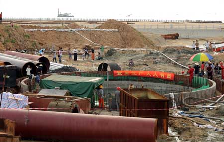 自6月10日19時(shí)45分許?谑邪咨抽T污水處理廠擴(kuò)建項(xiàng)目排海工程透水事故發(fā)生以來,5名失蹤工人已被封閉在排海管中長(zhǎng)達(dá)20小時(shí),生存的希望幾乎為零。目前事故處置工作重心已由搜救轉(zhuǎn)為搜尋失蹤者。這是搜救工作現(xiàn)場(chǎng)。