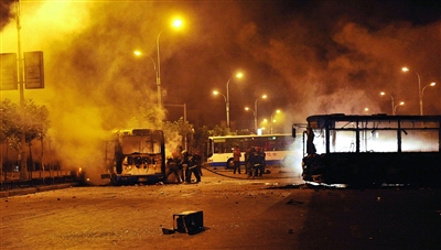 5日晚上,烏魯木齊發(fā)生打砸搶燒嚴(yán)重暴力犯罪事件。在此次事件中,烏魯木齊被毀車輛達(dá)260部,其中190部公交車,50多部民用車;受損門面房203間,民房14間,總過火面積達(dá)到56850平方米,全市共有220多處縱火點(diǎn),有兩棟樓房被燒毀。