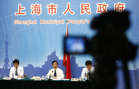 7月28日,上海市安全監(jiān)管局局長(zhǎng)謝黎明(中)正在介紹事故處理結(jié)果。新華社記者 裴鑫