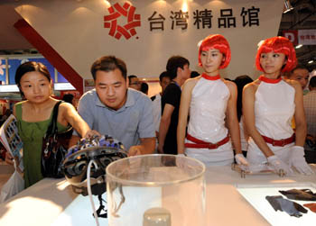 9月9日,正在福建廈門舉行的第十三屆中國國際投資貿(mào)易洽談會上,觀眾在臺灣精品館觀看臺灣制造的富有創(chuàng)意的自行車帽。新華社記者:張國俊