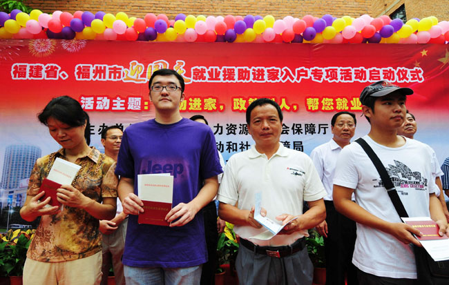 9月14日,福建省、市、區(qū)領導為就業(yè)困難人員發(fā)放福建省第一批《就業(yè)失業(yè)登記證》及政策宣傳手冊。當日,“福建省、市2009年迎國慶就業(yè)援助進家入戶專項活動”在福州市中山社區(qū)舉辦啟動儀式。福州市四城區(qū)公共就業(yè)服務機構及其42街道(鄉(xiāng)鎮(zhèn))297個社區(qū)勞動保障機構代表400多人參加啟動儀式。據了解,就業(yè)援助、進家入戶專項活動主題為:援助進家,政策到人,幫您就業(yè);顒訛槠诎雮月。 |
