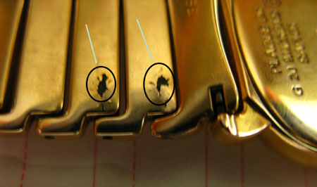 2年后,賀先生突然發(fā)現(xiàn),表帶和表殼上出現(xiàn)針尖大小的黑點(diǎn),經(jīng)過專業(yè)手表維修店清洗后,黑點(diǎn)沒有消失。此后,賀先生目睹黑點(diǎn)逐漸擴(kuò)大成一塊塊黑斑。北京一位手表專業(yè)維修人員告訴賀先生:“真正的18K包金表殼、表帶戴在手上是不會生銹腐爛的!