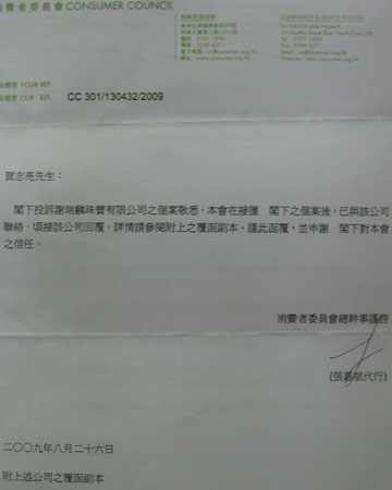 2009年9月10日,賀先生收到了香港消費(fèi)者委員會轉(zhuǎn)達(dá)的謝瑞麟珠寶公司就此事給該會的正式書面復(fù)函,復(fù)函內(nèi)容為——“本公司已將客人的投訴內(nèi)容向供應(yīng)商反映,經(jīng)供應(yīng)商了解后表示: