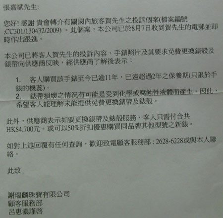 2.表帶損壞之情況有可能是受到化學(xué)或腐蝕性液體而產(chǎn)生。(注:我長期在辦公室工作,除了人體汗液,根本不可能接觸‘化學(xué)或腐蝕性液體’,謝瑞麟珠寶公司在復(fù)函中只講表帶,只字不提表殼銹蝕腐爛的問題)。