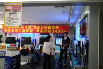 截至11月4日,上海市共回收廢舊家電47.6萬臺,銷售家電42.6萬臺,銷售金額17.6億元,補(bǔ)貼額達(dá)1.33億元。在回收廢舊家電品類中,彩電最多,占比超過79%。家電連鎖企業(yè)上海永樂電器、上海蘇寧電器、上海國美電器合計(jì)回收廢舊家電占比達(dá)87%,合計(jì)銷售新家電無論從銷售量還是銷售金額上占比都超過85%。據(jù)上海永樂統(tǒng)計(jì),8月15日實(shí)施家電以舊換新政策以來,彩電銷售量同比增長近一倍,考慮到去年北京奧運(yùn)會期間彩電銷售下滑的影響,同比增長也應(yīng)超過50%。上海蘇寧電器也表示,家電以舊換新政策對彩電的銷售拉動作用較大,期間蘇寧彩電銷售額同比增長45%。