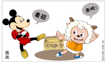 “迪士尼里有喜羊羊和灰太狼嗎?”聽到媽媽說2012年要帶自己去上海逛迪士尼樂園,5歲的小雅抱著喜羊羊的毛絨玩偶好奇地問。在她天真爛漫的小心靈里,喜羊羊和灰太狼的地位一點兒也不比米老鼠和唐老鴨遜色,因為它們都能令她感到快樂。 今年電影版的《喜羊羊和灰太郎》吸取美國《貓和老鼠》經(jīng)驗,在前期培育了大批忠實觀眾的基礎(chǔ)上,最終取得了創(chuàng)意和票房的雙豐收。有人認為,中國年輕的動漫產(chǎn)業(yè)或能借此契機迎頭趕上;但是,比起以迪士尼為代表的美日動漫王國,喜羊羊是否已經(jīng)具有抗衡米老鼠的能力?