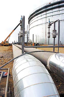 這是中哈原油管道國(guó)內(nèi)段首站已完工的兩座5萬立方米儲(chǔ)油罐。中哈原油管道西起哈薩克斯坦的阿塔蘇,東到我國(guó)新疆邊境的阿拉山口,是中國(guó)和哈薩克斯坦兩國(guó)歷史上第一條跨國(guó)輸油管道。