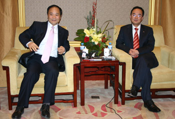 吉利汽車集團(tuán)董事長李書福(左)與副總裁安聰慧接受本報(bào)記者專訪。 記者 吳華國/攝 |