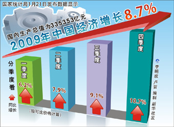 2009年的中國經(jīng)濟(jì)終于交出了一份滿意的答卷。在黨中央一系列反危機(jī)政策措施的強(qiáng)力作用下,中國經(jīng)濟(jì)成功抵御住了國際金融危機(jī)的巨大沖擊,而且快于大多數(shù)西方國家在一年之內(nèi)得到復(fù)蘇。經(jīng)濟(jì)回升走出了人們事先敢想而不敢求的V形軌跡,全年GDP(國內(nèi)生產(chǎn)總值)同比增長達(dá)到8.7%。一年前,中央政府提出的“保八”目標(biāo)超預(yù)期達(dá)成。 雖然經(jīng)濟(jì)的增長速度比去年回落了0.9個(gè)百分點(diǎn),但是國家統(tǒng)計(jì)局局長馬建堂認(rèn)為,2009年國民經(jīng)濟(jì)總基調(diào)是“回升向好”。他在發(fā)布會(huì)上強(qiáng)調(diào),去年中國經(jīng)濟(jì)的成就,是在新世紀(jì)以來中國經(jīng)濟(jì)發(fā)展最為困難的一年取得的,極為不易。就GDP增長而言,逐季上升,四季度增長已從一季度的6.2%上升到10.7%。 各主要經(jīng)濟(jì)指標(biāo)也紛紛回暖:全年社會(huì)固定資產(chǎn)投資224846億元,比上年增長了30.1%,增速比上年加快4.6個(gè)百分點(diǎn);全年社會(huì)消費(fèi)品零售總額125343億元,扣除價(jià)格因素實(shí)際增長16.9%,實(shí)際增速比上年同期加快2.1個(gè)百分點(diǎn);工業(yè)生產(chǎn)逐季回升,實(shí)現(xiàn)利潤由大幅下降轉(zhuǎn)為增長;進(jìn)出口也在11月份由降轉(zhuǎn)升,12月份增長32.7%。 展望2010年,馬建堂更是樂觀。他說,2010年的中國經(jīng)濟(jì)總體上將會(huì)繼續(xù)保持2009年的勢(shì)頭,繼續(xù)保持平穩(wěn)較快的發(fā)展。同日發(fā)布的摩根大通最新報(bào)告,將中國2010年GDP增長的預(yù)估從9.7%調(diào)升至10%。 交通銀行金融研究中心高級(jí)宏觀分析師唐建偉稱,2010年中國經(jīng)濟(jì)增長將重回上升周期。他說,中國經(jīng)濟(jì)在擺脫全球金融危機(jī)的負(fù)面影響之后,經(jīng)濟(jì)增長的內(nèi)生動(dòng)力已經(jīng)逐步恢復(fù)并將不斷增強(qiáng),從而推動(dòng)中國經(jīng)濟(jì)增長重回上升周期。就經(jīng)濟(jì)增長的動(dòng)力而言,預(yù)計(jì)2010年三駕馬車將呈現(xiàn)“兩升一降”的格局,即消費(fèi)和凈出口的增長將加速,對(duì)經(jīng)濟(jì)增長的貢獻(xiàn)率上升;而投資的增速將有所放慢,對(duì)經(jīng)濟(jì)增長的貢獻(xiàn)率下降。 “初步預(yù)計(jì),2010年國內(nèi)GDP增速有望進(jìn)一步回升,全年將達(dá)到10%左右!碧平▊(duì)《經(jīng)濟(jì)參考報(bào)》記者說:“從季度增長率來看,2010年經(jīng)濟(jì)很可能呈現(xiàn)前高后低的走勢(shì),初步以大數(shù)估計(jì)四個(gè)季度經(jīng)濟(jì)增長率分別為11%、10%、9%、10%。一季度經(jīng)濟(jì)增長率將成為年內(nèi)高點(diǎn),這主要是因?yàn)?009年一季度的基數(shù)較低的原因;二三季度經(jīng)濟(jì)增長率有所回落主要和政策效應(yīng)的減弱以及基數(shù)較高有關(guān)!
