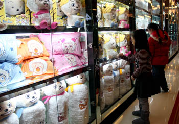 日前,小朋友們被北京一家影院展示的“喜羊羊”玩具吸引!跋惭蜓颉毕破鸬膰(guó)產(chǎn)動(dòng)漫熱,帶動(dòng)了玩具、文具、服裝等動(dòng)漫衍生產(chǎn)品的發(fā)展。新華社發(fā) 趙琬微/攝 |