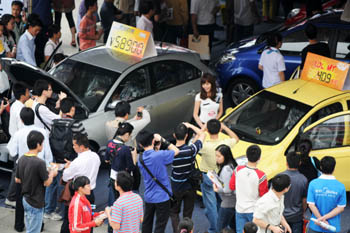日前,在南寧國際會展中心舉辦的北部灣(南寧)第四屆汽車展上,50多個品牌的250多款汽車吸引眾多市民前往參觀選購。香車、美女吸引了眾多市民的眼球,現(xiàn)場熱鬧非凡。圖為南寧市市民在北部灣(南寧)第四屆汽車展上看車。新華社記者 李斌/攝