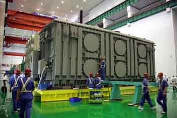 2009年9月5日,中國(guó)首臺(tái)一次試驗(yàn)合格的正負(fù)800千伏特高壓直流變壓器由沈陽變壓器集團(tuán)有限公司研制成功。本報(bào)記者 張燕輝/攝
