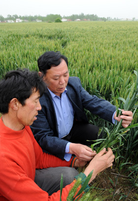 5月9日,河南省駐馬店市驛城區(qū)農(nóng)業(yè)技術(shù)推廣站技術(shù)員胡福流(右)在田間為農(nóng)民指導(dǎo)農(nóng)業(yè)生產(chǎn)。新華社記者 朱祥