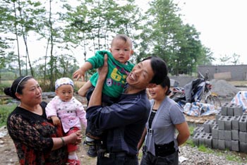 5月10日,黃長容、王興林夫婦和他們地震后降生的兒子王俊杰與鄰家的小妹妹在一起。他的兒子和這個小女孩都是“再生育全程服務(wù)行動”下出生的“地震寶寶”。新華社記者