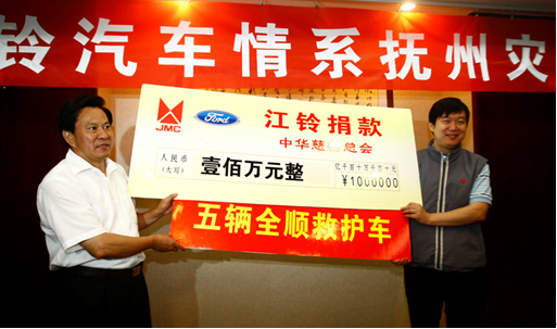 在江西等地發(fā)生的嚴(yán)重洪澇災(zāi)害,造成了巨大的人員財(cái)產(chǎn)損失,牽動(dòng)著國(guó)人的心。江鈴汽車(chē)股份有限公司全體員工心系災(zāi)區(qū)人民,在第一時(shí)間作出反應(yīng),得到福特汽車(chē)公司和江鈴集團(tuán)的支持,迅速組織賑災(zāi)捐贈(zèng),在公司董事長(zhǎng)王錫高指示下,公司緊急捐贈(zèng)5輛災(zāi)區(qū)急需的福特全順救護(hù)車(chē)并捐款100萬(wàn)元人民幣,總計(jì)200萬(wàn)元的款物給受災(zāi)最嚴(yán)重的撫州洪澇災(zāi)區(qū)。