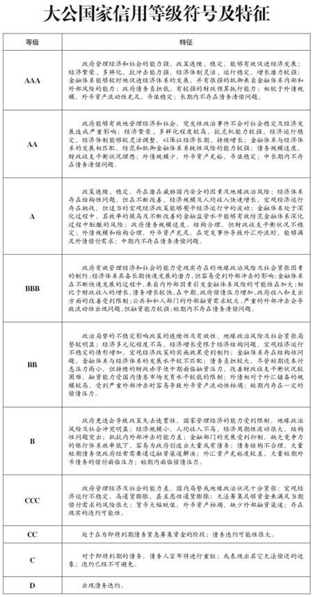根據(jù)確定的影響國家信用風(fēng)險五大關(guān)鍵評級要素及能夠刻畫這些要素的具體指標(biāo),大公建立了國家信用評級操作系統(tǒng)。錄入指標(biāo)數(shù)據(jù),依據(jù)設(shè)定的評分方法和評分標(biāo)準,系統(tǒng)會產(chǎn)生初始信用等級,之后經(jīng)過信用評審委員會的調(diào)整形成最終的本、外幣國家信用等級。其具體思路和步驟如下: 第一步,分別確定國家管理能力、經(jīng)濟實力、金融實力、財政實力及外匯實力的信用分值。 以國家管理能力為例,首先對其中的各項指標(biāo)進行模型量化處理,接下來將得分加權(quán)平均,得到一國國家管理能力的最初得分,之后評審會會綜合考慮在模型中沒有體現(xiàn)的該國在國家管理能力方面的特有優(yōu)勢或劣勢,并通過國家間的比較,對初始得分進行一定調(diào)整,最后得到該國家的最終得分。分值區(qū)間從0到9,0分代表風(fēng)險最高,9分代表風(fēng)險最低。 第二步,對前四大要素進行加權(quán)平均,得到本幣信用分值,并將分值對應(yīng)為信用等級。 大公國家信用等級從高到底,從AAA到D共十個等級。除“AAA”、“C”和“D”等級外,每個信用等級可用“+”或“-”進行微調(diào),分別表示比相應(yīng)等級的信用質(zhì)量稍高或稍低。 第三步,綜合外匯實力得分,對本幣信用等級進行調(diào)整,得到外幣信用等級。 外匯實力很強的國家,外幣信用等級有可能超過本幣信用等級,但在多數(shù)情況下,外幣信用等級會等于或低于本幣信用等級。 這樣,最終得到了本幣和外幣的國家信用等級。下面列出大公國家信用等級符號及相應(yīng)等級的信用風(fēng)險特征。應(yīng)強調(diào)的是,被評定為某一信用等級的國家,并非必須滿足該信用等級相對應(yīng)的所有特征,但一般應(yīng)滿足其中多項特征。